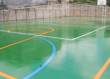 Área total de 600 m² com base de concreto nivelado e pintura epóxi em duas demãos coloridas (verde e laranja). A superfície foi demarcada para futsal, basquete e vôlei, proporcionando alta aderência e resistência ao desgaste.